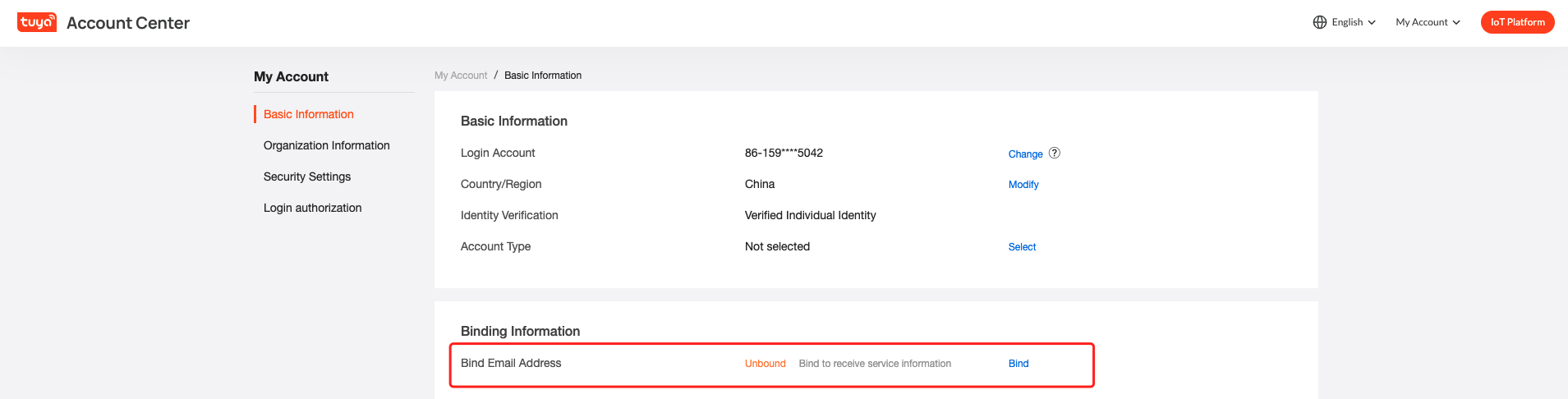 On the page that appears, bind or unbind your email address in the Basic Information section.