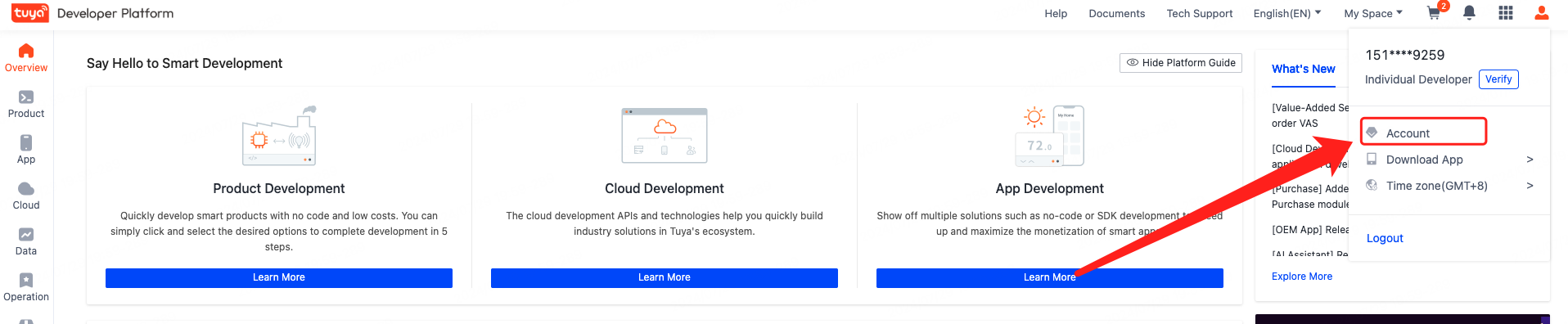 Log in to Tuya Developer Platform. Click the user profile icon in the top right corner and select Account.
