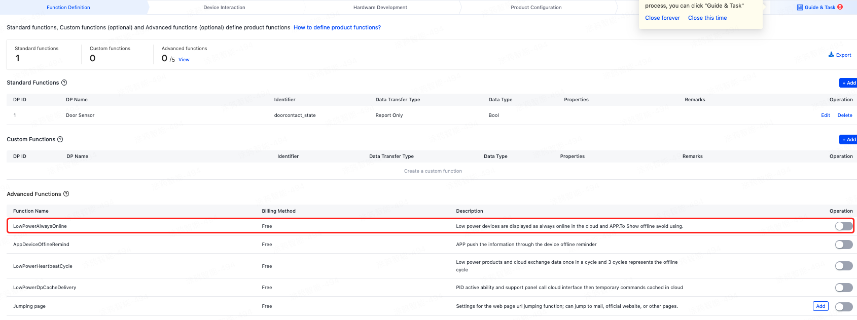 For example, products such as low-power door sensors will always be displayed online if the low-power permanent online advanced function is enabled during function definition. (If permanent online is turned off, such products will be reported as online within the low-power heartbeat interval configured for advanced functions, and will not be reported as offline after this time.)