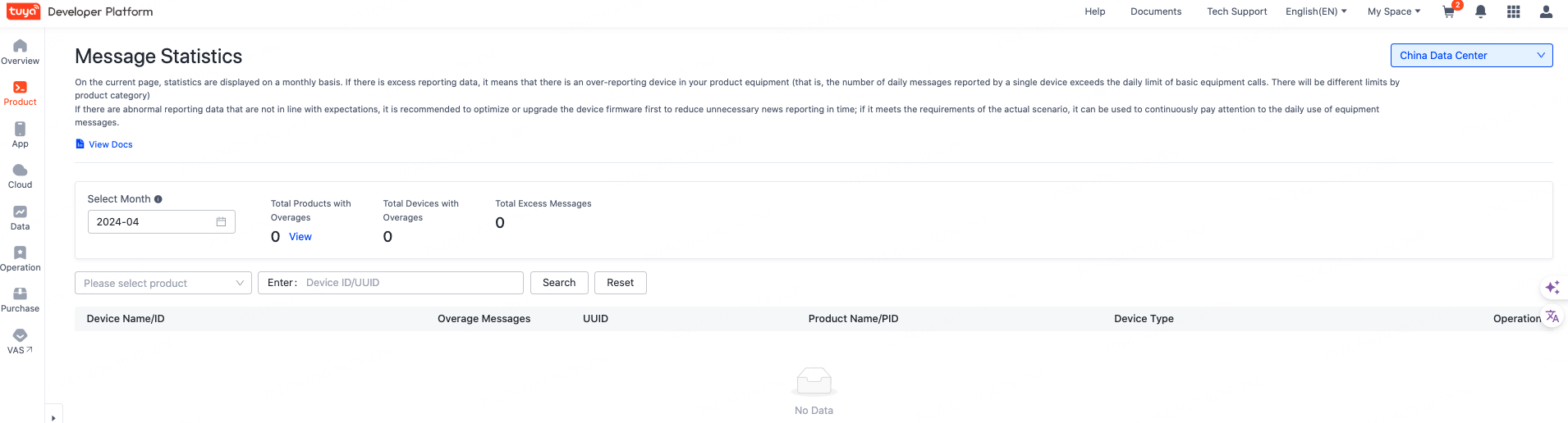 Log in to the Tuya developer platform, and you can view the device data reporting statistics under Products - Device - Message Statistics, as shown in the following image: