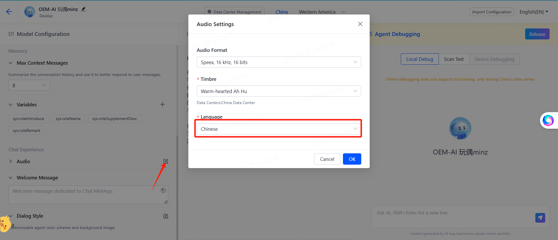 Please refer to the following figure to change the agent voice language.