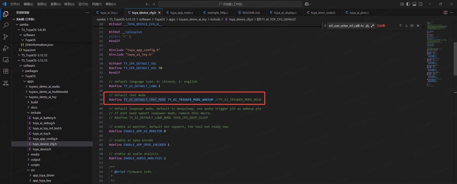 Replace TY_AI_TRIGGER_MODE_WAKEUP in the tuya_device_cfg.h file in the include directory of the apps/ai_toy_demo project in the SDK with the mode you want. The operation is as follows:
