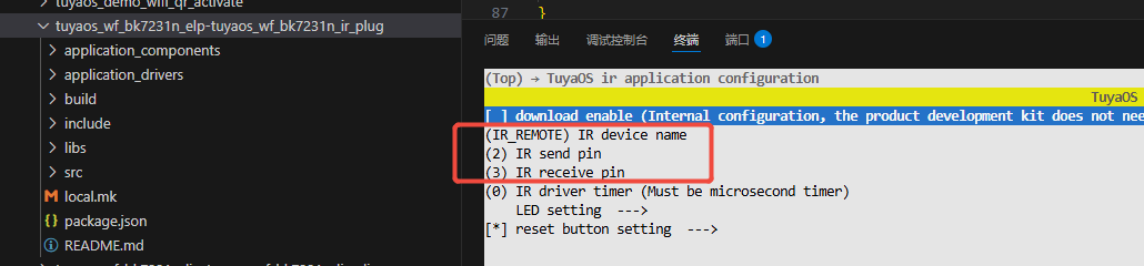 You need to right-click on the demo tuyaos_wf_bk7231n_elp-tuyaos_wf_bk7231n_ir_plug, select config project, and fill in the send and receive pins in the irTuyaOS ir application configuration as follows: