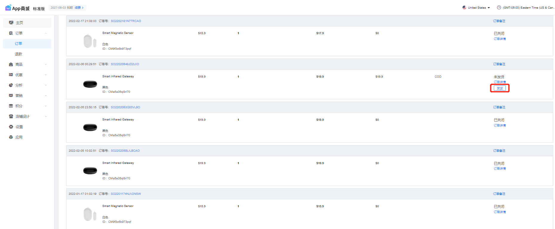 订单列表默认按照下单时间由新到旧排列。您可根据订单的状态进行操作,在菜单栏 分析 中下载查看。App 商城支持导出三种格式模板的订单报表。