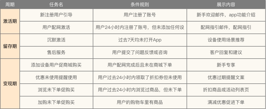 基于用户生命周期和商城运营的需要,我们可以制度一套内容宣传的计划,并通过智能运营平台进行自动化营销。
