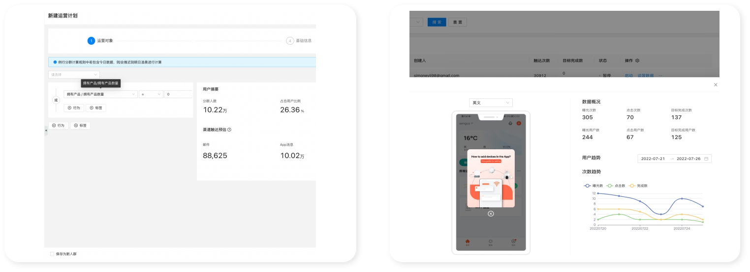 如何设置:智能运营平台-- 通过标签组合选出人群--选择展示位置(banner/弹窗/push等)--添加图片素材和跳转链接--观察数据结果