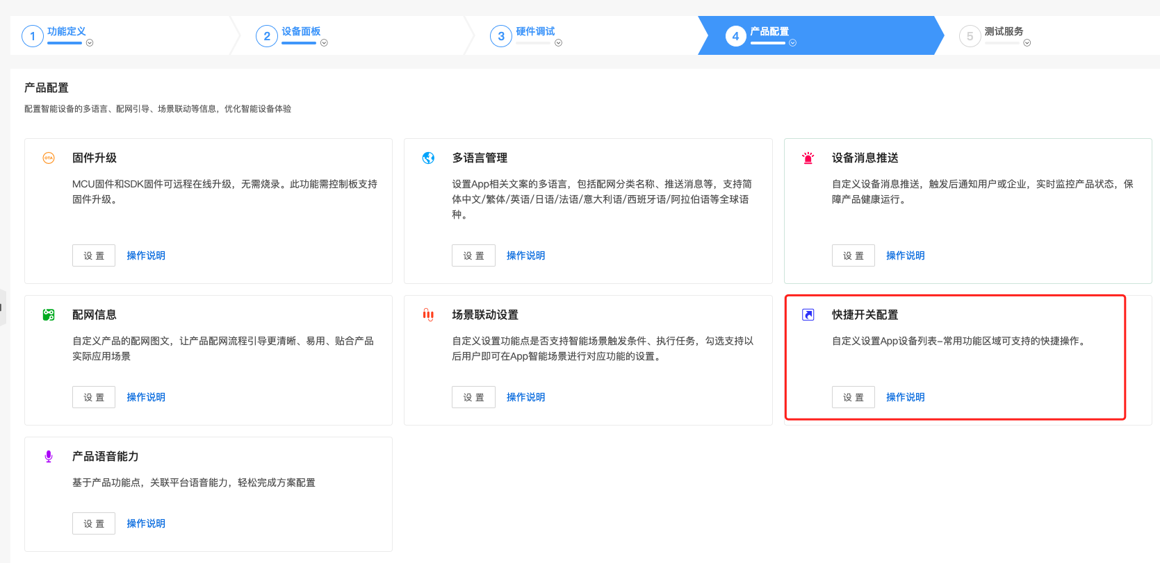 您可以前往 IoT 平台对应产品开发页,选择第 4 步“产品配置”,选择“快捷开关配置”,点击“设置”,勾选“开关”后,该产品即可在 Apple Watch 中显示并被控制。