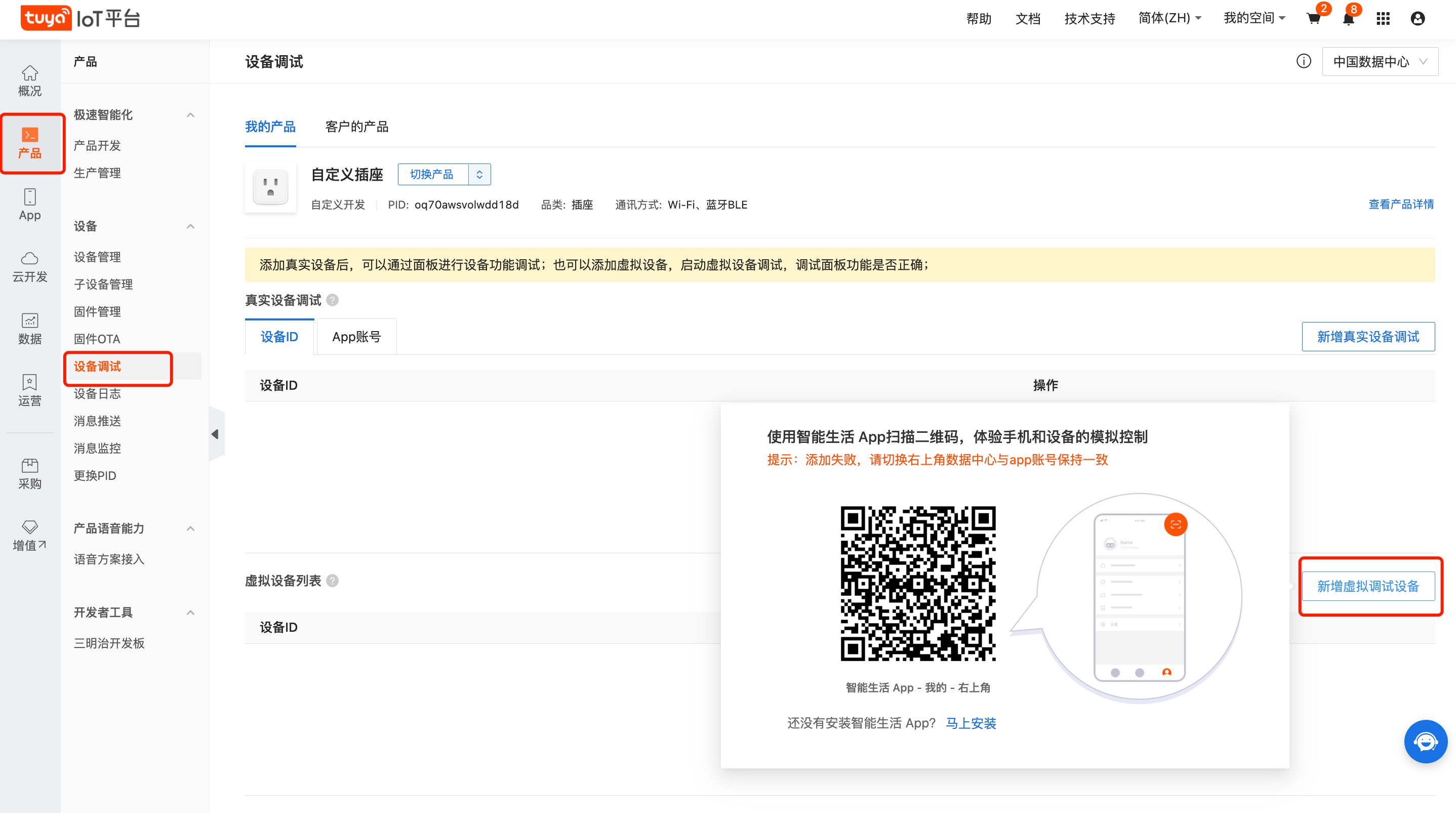 进入“产品-设备-设备调试“页面,点击“新增虚拟调试设备“,扫码就可以调试。