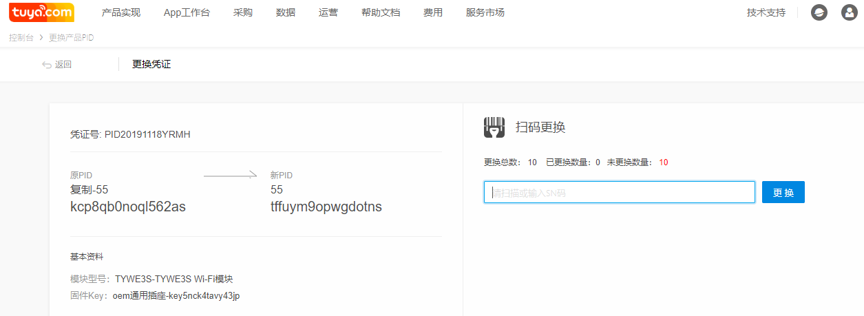 可以。若无扫码枪,在IOT平台找到申请到的pid替换凭证,导出替换的SN,手动输入SN号码替换。
