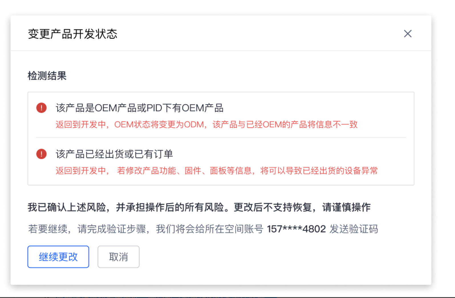 进入【产品概览】点击右上角【返回开发中】,若非风险情况,可以直接确认返回。若返回有风险,会给予下图提示。需要该PID所属人接受到验证码并填写。一旦填写,则表明的操作人已知返回开发状态后,操作带来的影响和风险。