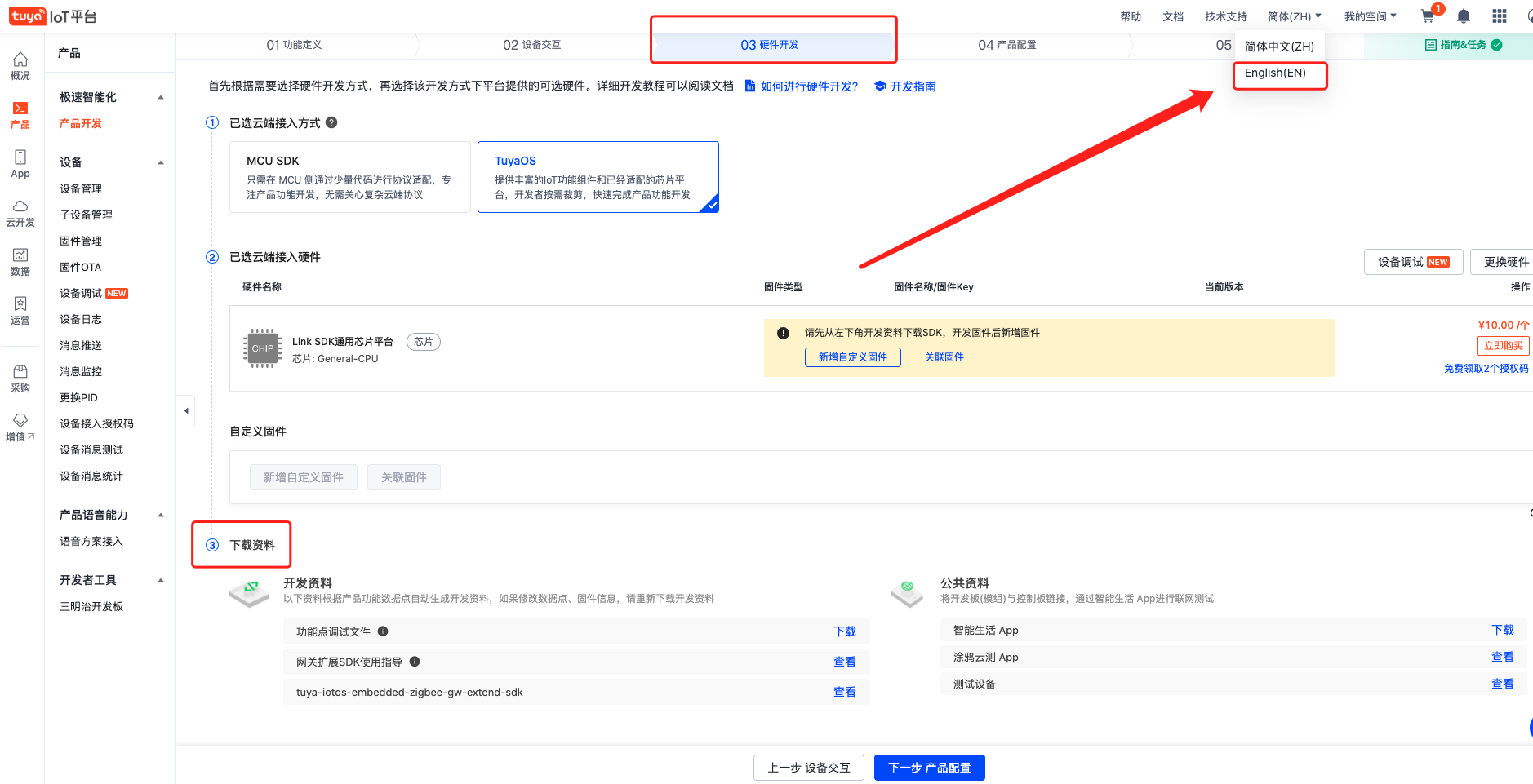 )。如果需要英文版的开发资料,您只需要在平台页面的右上角切换成英语状态即可。
