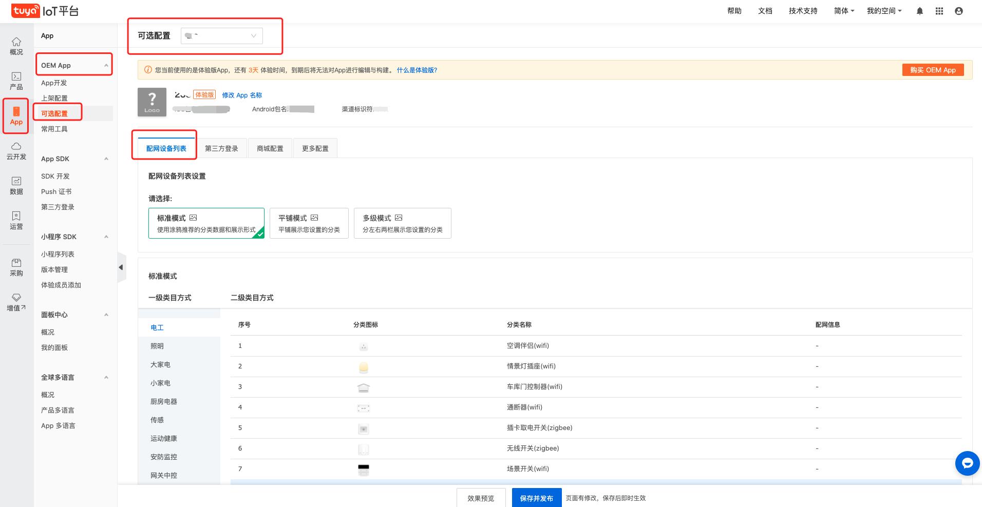 请您登录平台进入 App -- OEM App -- 可选配置 页面,选择您要查看的 OEM App,在 配网设备列表 的tab页确认选择的模式是哪种: