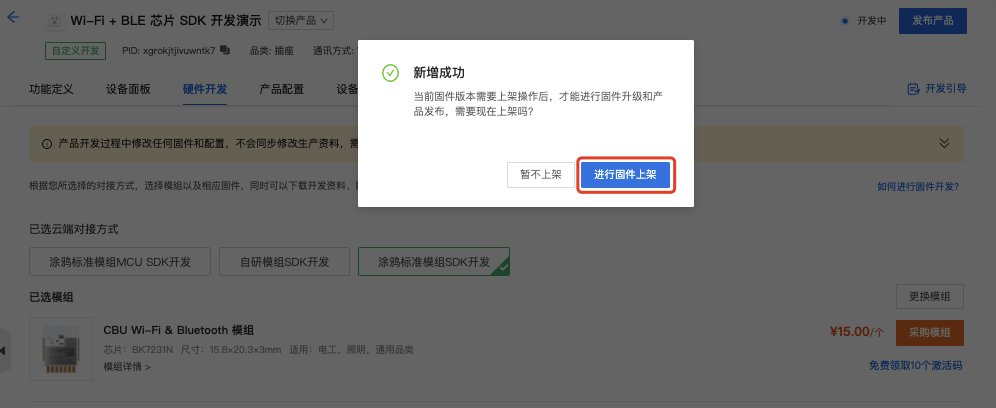 您需要将编译生成的固件上传至涂鸦 IoT 平台,以便下单获取对应的授权码,详细的流程如下: