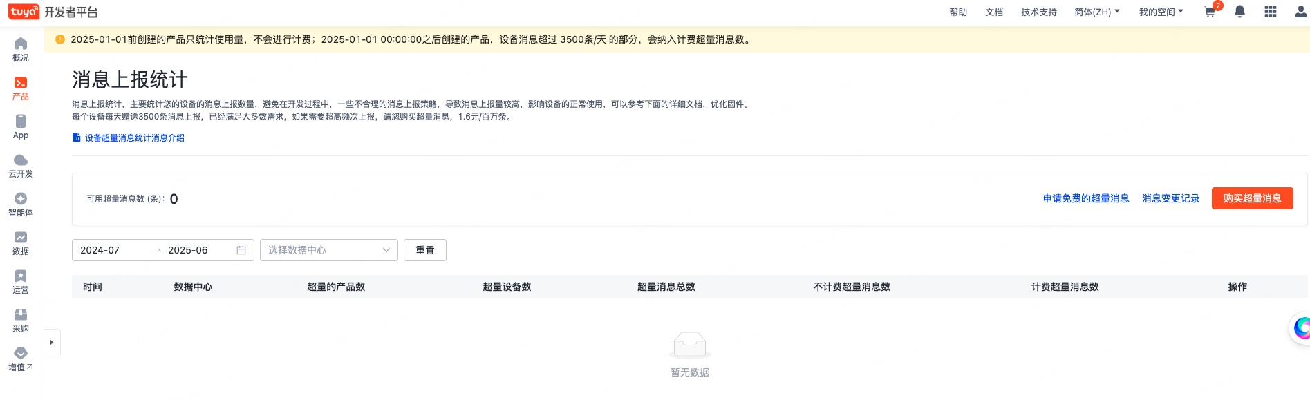 登录涂鸦开发者平台,在产品-设备-消息上报统计 这里可以查看设备上报数据,如下图: