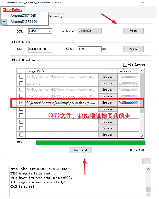 - 打开烧录软件,然后配置如下,点击Download,烧录成功下⾯log会提示烧录成功。