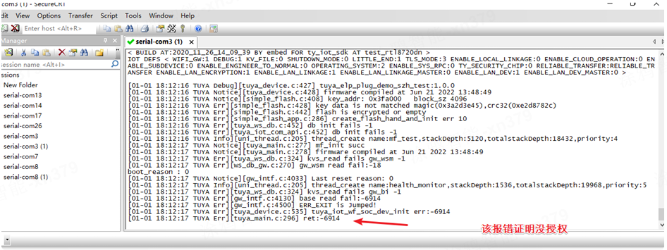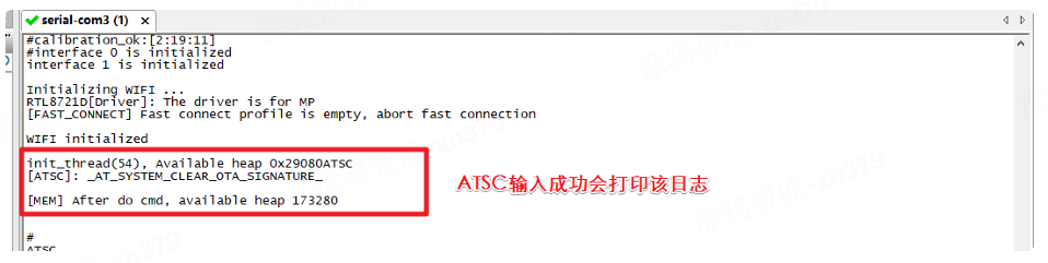 烧录完固件后打开串⼝软件,重启模组会显示如图⽇志,然后选在日志串口号使用串口工具发送中输⼊ATSC\r\n(注意这里需要加回车换行,否则可能启动失败)字符串发送,如图: