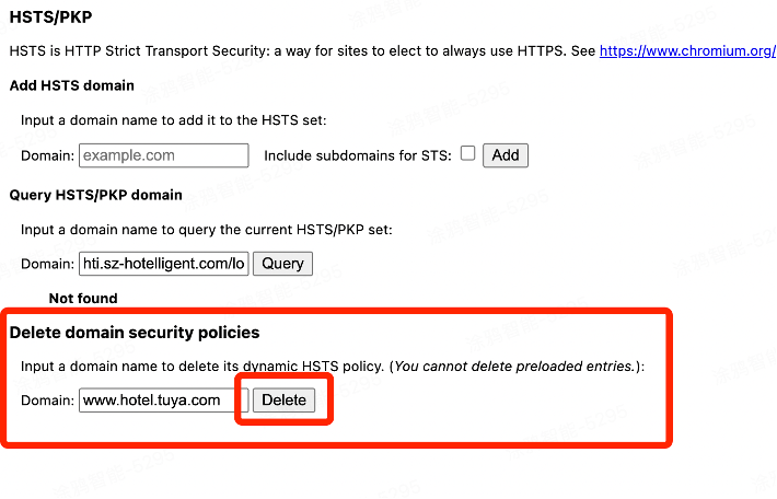 1、在浏览器地址栏输入:chrome://net-internals/#hsts回车。然后在Delete domain security policies栏输入SSL过期证书的域名地址,如:www.hotel.tuya.com,点击delete删除。